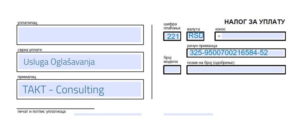 Sve što treba da uradite je da popunite uplatnicu prema prikazanom primeru. Nakon što izvršite uplatu, kontaktirajte nas kako bismo odmah aktivirali vašu reklamu.